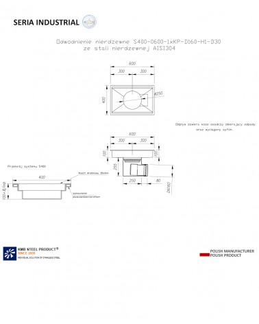 Kanał rynnowy Industrial o nazwie S400-0600-1xKP-D160-H1-D30 to idealnie dopasowane odwodnienie liniowe o szerokości 400 mm. Cena zawiera akcesoria: 1 odpływ poziomy H1 na środku - skierowany prostopadle do odwodnienia, sitko, syfon, ruszt drabinowy. Materiał wykonania to stal nierdzewna AISI 304.