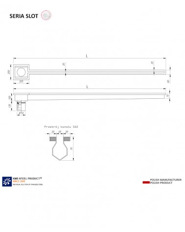 Kanał szczelinowy SLOT o nazwie S60 to idealnie dopasowane odwodnienie liniowe o szerokości 200 mm. Cena zawiera akcesoria: 1 odpływ na końcu, sitko, syfon. Materiał wykonania to stal nierdzewna AISI 304.