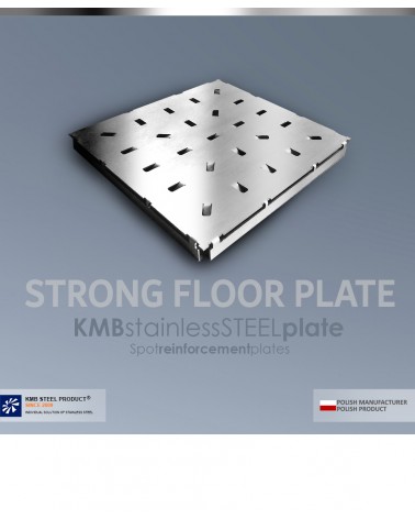 Płytka nierdzewna - podłogowa KMB o nazwie STRONG Floor SF-300x300-2mm to płytka wykonana w całości ze stali nierdzewnej AISI 304, z blachy o grubości 2 mm.