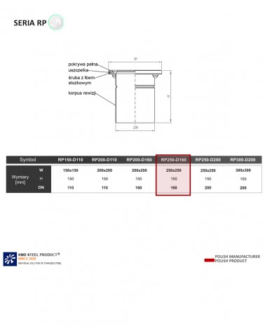 Rewizja RP-250-D160 oznacza wymiar góry elementu rewizyjnego 250 x 250 mm, DN160 to odpływ wchodzący w rurę o średnicy 160, V1 to rodzaj odpływu - VERTICAL, tj. pionowy.