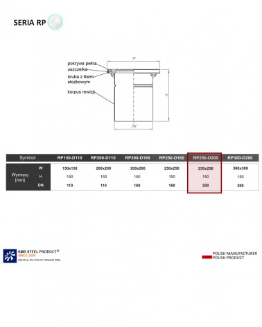 Rewizja RP-250-D200 oznacza wymiar góry elementu rewizyjnego 250 x 250 mm, DN200 to odpływ wchodzący w rurę o średnicy 200, V1 to rodzaj odpływu - VERTICAL, tj. pionowy.