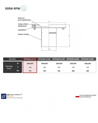 Rewizja pod wypełnienie o nazwie RPW-200-D110 to idealnie dopasowane rozwiązanie rewizyjne. Cena rewizji zawiera akcesoria: płyta pod wypełnienie, śruby, uszczelka.