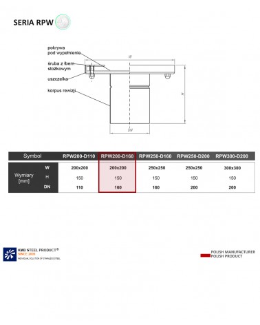 Rewizja pod wypełnienie o nazwie RPW-200-D160 to idealnie dopasowane rozwiązanie rewizyjne. Cena rewizji zawiera akcesoria: płyta pod wypełnienie, śruby, uszczelka.