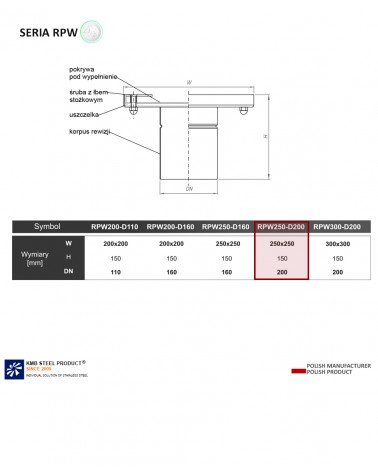 Rewizja pod wypełnienie o nazwie RPW-300-D200 to idealnie dopasowane rozwiązanie rewizyjne. Cena rewizji zawiera akcesoria: płyta pod wypełnienie, śruby, uszczelka.