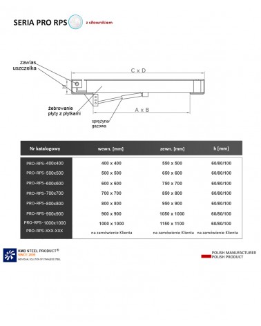 Właz nierdzewny PRO RPS- 60 z siłownikiem to właz z pokrywą pełną gładką, o wysokości 60 mm, otwierany ze wspomaganiem siłownika.