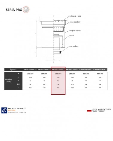 KP200 oznacza wymiar góry odwodnienia 200 x 200 mm, DN110 to odpływ wchodzący w rurę o średnicy 110, a V1 to rodzaj odpływu – VERTICAL, tj. pionowy.
