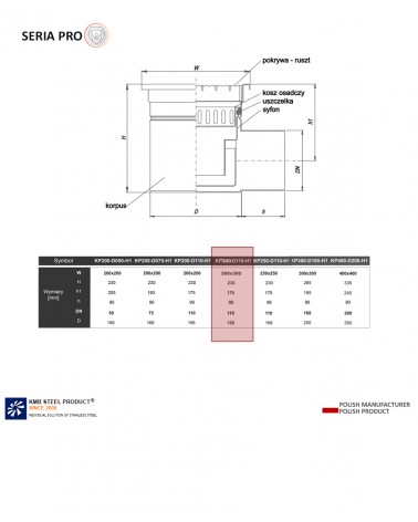 Wpust KP300 oznacza wymiar góry odwodnienia 300 x 300 mm, DN110 to odpływ wchodzący w rurę o średnicy 110, H1 to rodzaj odpływu - HORIZONTAL, tj. poziomy.