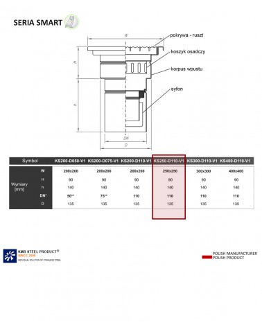 Wpust KS250 oznacza wymiar góry odwodnienia 250 x 250 mm, DN110 to odpływ wchodzący w rurę o średnicy 110, V1 to rodzaj odpływu - VERTICAL, tj. pionowy.
