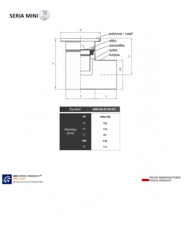 Wpust KM150 oznacza wymiar góry odwodnienia 150 x 150 mm, DN110 to odpływ wchodzący w rurę o średnicy 110, H1 to rodzaj odpływu - HORIZONTAL, tj. poziomy.