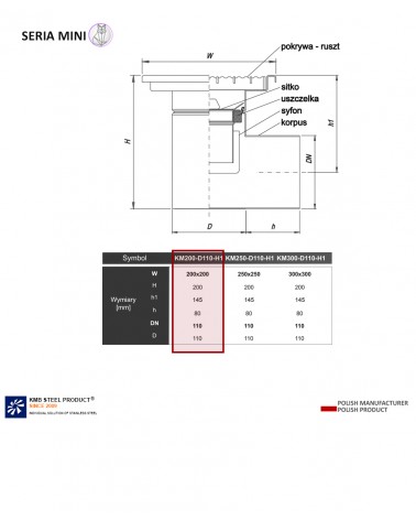 KM200 oznacza wymiar góry odwodnienia 200 x 200 mm, natomiast DN110 to odpływ wchodzący w rurę o średnicy 110, a H1 to rodzaj odpływu – HORIZONTAL, tj. poziomy.