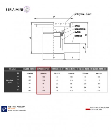 Wpust KM200 oznacza wymiar góry odwodnienia 200 x 200 mm, DN075 to odpływ wchodzący w rurę o średnicy 075, H1 to rodzaj odpływu - HORIZONTAL, tj. poziomy.