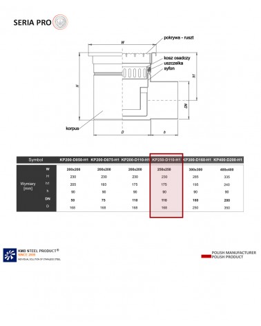 Wpust KP250 oznacza wymiar góry odwodnienia 250 x 250 mm, DN110 to odpływ wchodzący w rurę o średnicy 110, H1 to rodzaj odpływu - HORIZONTAL, tj. poziomy.