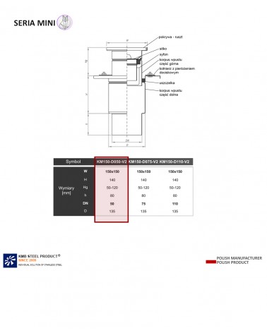 Wpust KM150 oznacza wymiar góry odwodnienia 150 x 150 mm, DN050 to odpływ wchodzący w rurę o średnicy 050, V2 to rodzaj odpływu - VERTICAL, tj. pionowy.