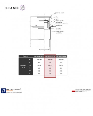 Wpust KM150 oznacza wymiar góry odwodnienia 150 x 150 mm, DN075 to odpływ wchodzący w rurę o średnicy 075, V2 to rodzaj odpływu - VERTICAL, tj. pionowy.