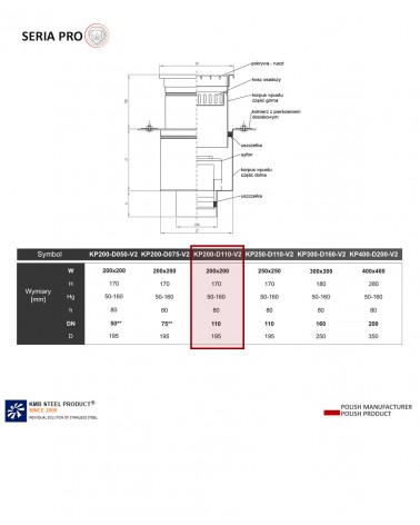 Wpust KP200 oznacza wymiar góry odwodnienia 200 x 200 mm, DN110 to odpływ wchodzący w rurę o średnicy 110, V2 to rodzaj odpływu - VERTICAL, tj. pionowy.