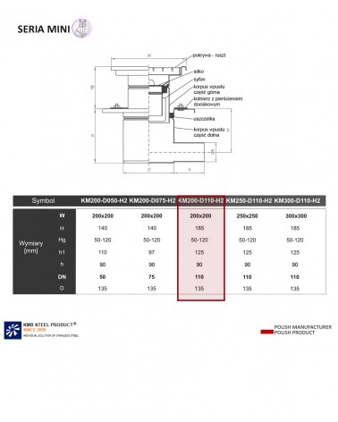Wpust KM200 oznacza wymiar góry odwodnienia 200 x 200 mm, DN110 to odpływ wchodzący w rurę o średnicy 110, H2 to rodzaj odpływu - HORIZONTAL, tj. poziomy.
