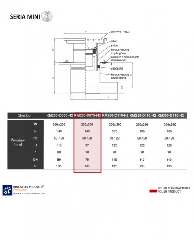 Wpust KM200 oznacza wymiar góry odwodnienia 200 x 200 mm, DN075 to odpływ wchodzący w rurę o średnicy 075, H2 to rodzaj odpływu - HORIZONTAL, tj. poziomy.