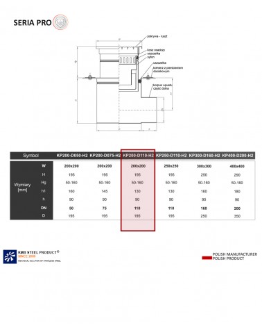 Wpust KP200 oznacza wymiar góry odwodnienia 200 x 200 mm, DN110 to odpływ wchodzący w rurę o średnicy 110, H2 to rodzaj odpływu - HORIZONTAL, tj. poziomy.