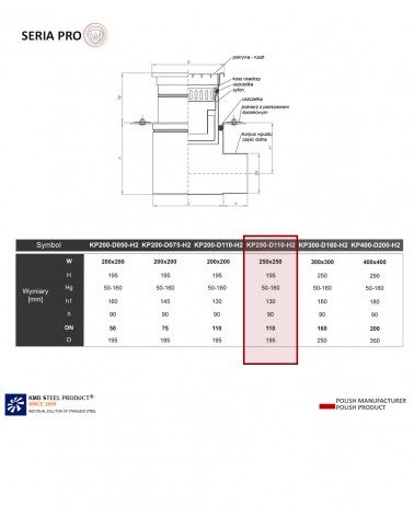 Wpust podłogowy PRO o nazwie KP250-DN110-H2 - stropowy to profesjonalne rozwiązanie PRO. Cena wpustu zawiera akcesoria: ruszt, kosz osadczy, syfon.