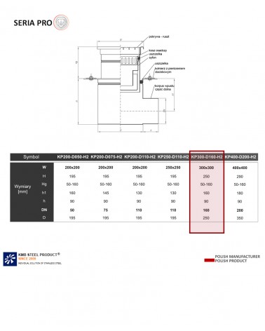 Wpust podłogowy PRO o nazwie KP300-DN160-H2 - stropowy to profesjonalne rozwiązanie PRO. Cena wpustu zawiera akcesoria: ruszt, kosz osadczy, syfon.